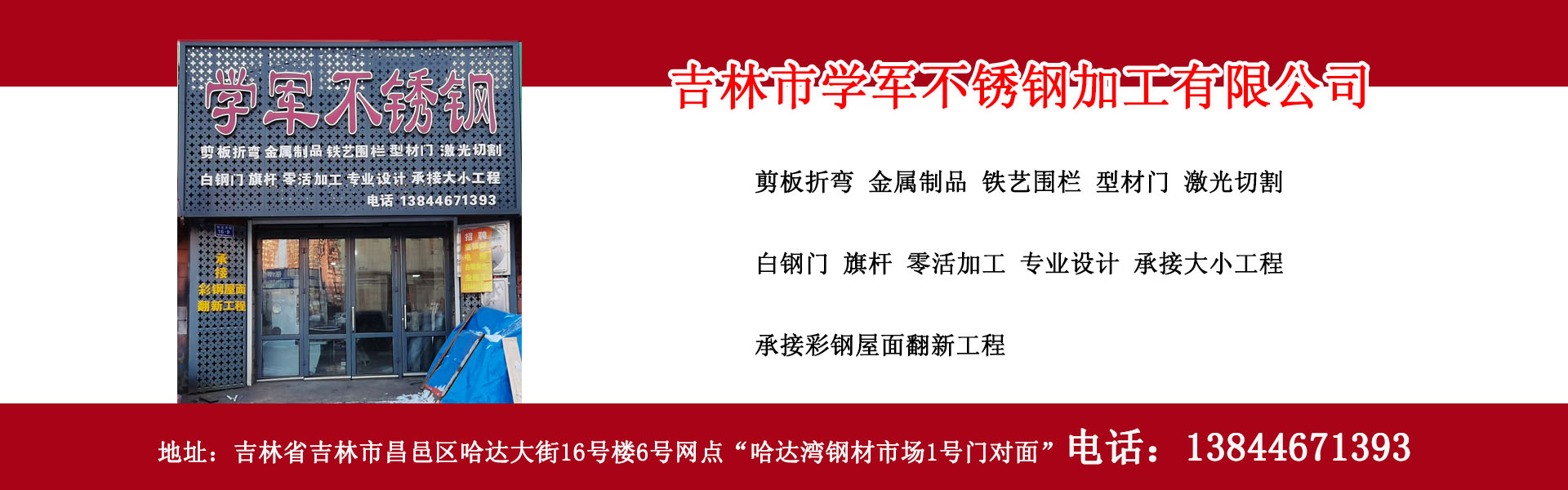 吉林市學軍不銹鋼加工有限公司專業從事吉林市不銹鋼加工制作、吉林市白鋼門制作、吉林市白鋼隔斷制作、吉林市剪板折彎、激光切割、型材門、電子感應門、旗桿制作、彩鋼屋面翻新、吉林市鐵藝圍欄加工制作等吉林市不銹鋼加工制作、吉林市金屬加工制作服務單位,位于吉林省吉林市。